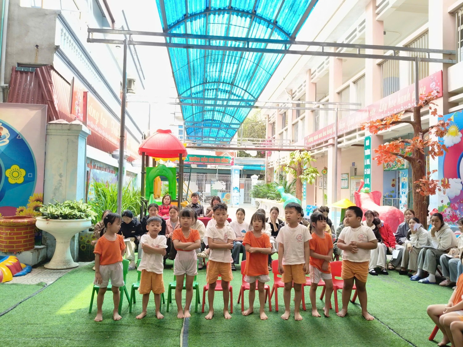 Để giúp các em sinh viên được quan sát những tiết dạy thực tế sinh động, hiệu quả nhất, hiểu và nắm được công tác tổ chức một tiết dạy. Các giáo viên tham gia dạy mẫu cùng ban giám hiệu nhà trường đã chuẩn bị kĩ lưỡng từ khâu xây dựng giáo án, chuẩn bị đồ dùng thiết bị dạy học, trang phục, lựa chọn nội dung bài học, phương pháp giáo dục, hình thức, quy trình tổ chức tiết học… phù hợp với đặc điểm tâm sinh lí lứa tuổi và khả năng của trẻ. Qua các hoạt động giáo dục thuộc các lĩnh vực phát triển thể chất được thực hiện ở 4 độ tuổi khác nhau do các cô giáo Hà Thị Duyên, Bùi Thị Ánh. Nguyễn Thị Hiền, Trần Thị Thuỷ thực hiện. Các bạn sinh viên đã được trực quan rõ ràng và học hỏi các kĩ năng dạy học, xử lí các tình huống trong tiết dạy cũng như áp dụng những kiến thức được học vào thực tế.