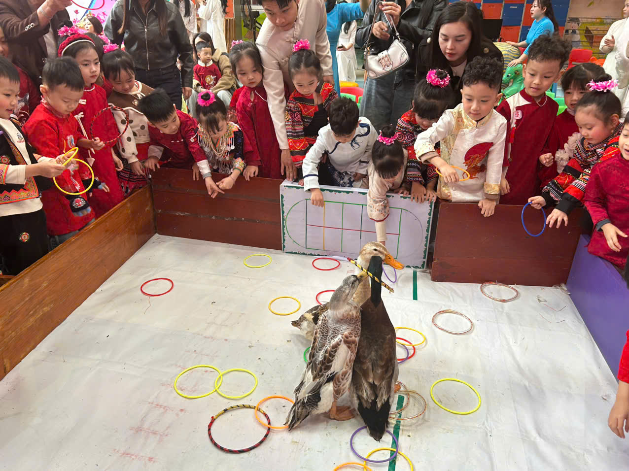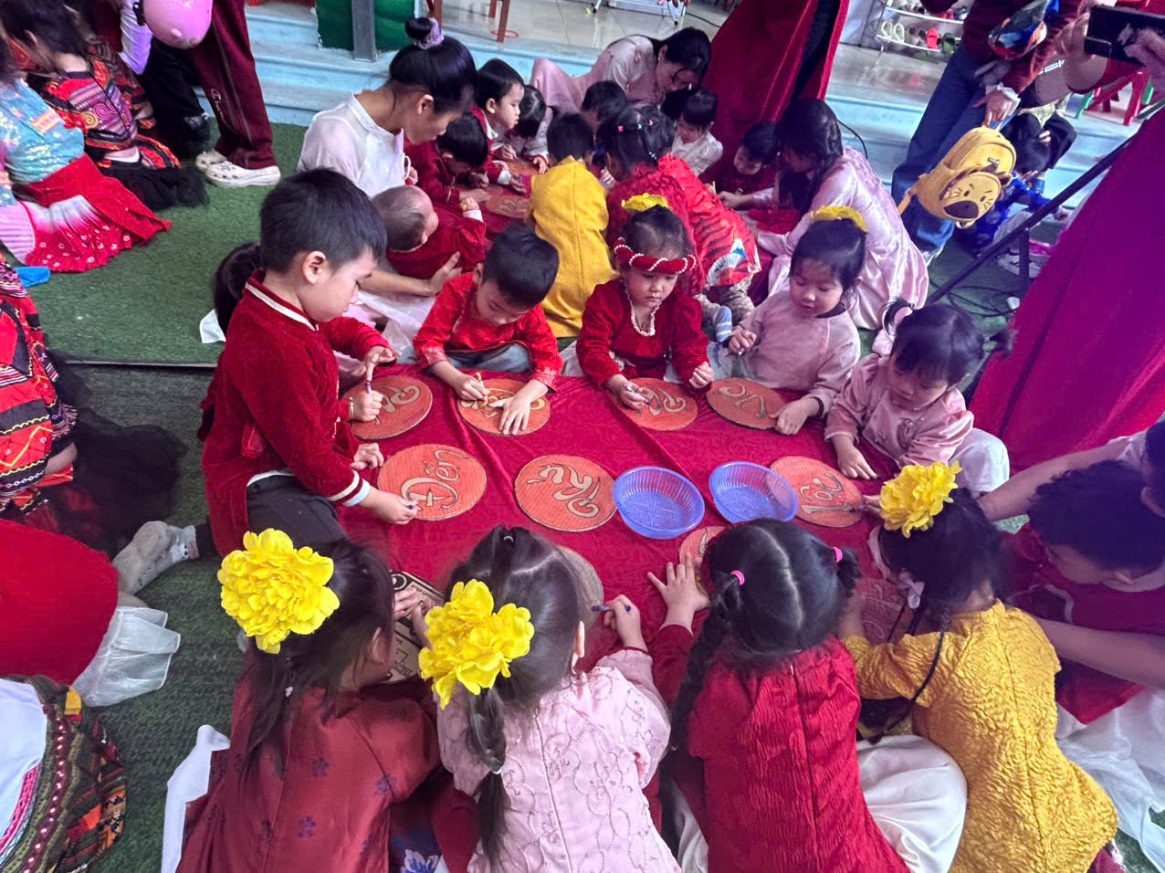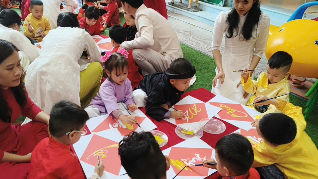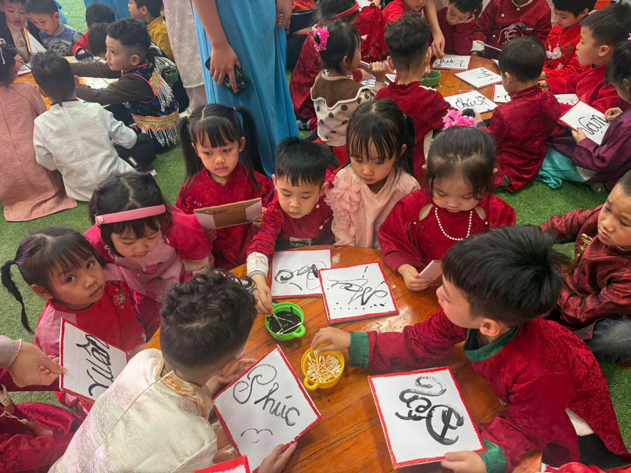 Đặc biệt, trong chương trình các cô giáo đã thiết kế, trang trí không gian chợ tết vô cùng phong phú và hấp dẫn. Các bé được hoá thân thành những ông đồ, nghệ nhân, thương nhân, du khách… tham gia trải nghiệm đi chợ tết, du xuân, viết thư pháp, câu đối, chơi các trò chơi dân gian mang đậm bản sắc của các dân tộc như: Ném còn, Ném vòng cổ vịt… Những hoạt động này giúp các bé hiểu thêm về phong tục đón Tết cổ truyền của mỗi dân tộc. Mang lại cho bé niềm vui, hứng khởi khi tết đến xuân sang và những khoảnh khắc thật đáng nhớ bên cô giáo và bạn bè.