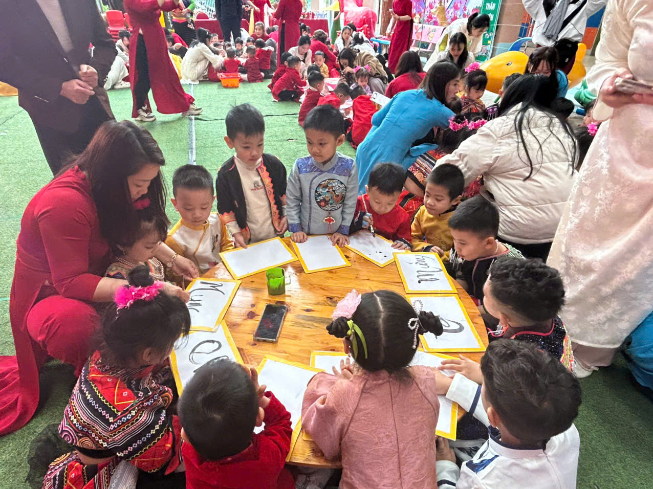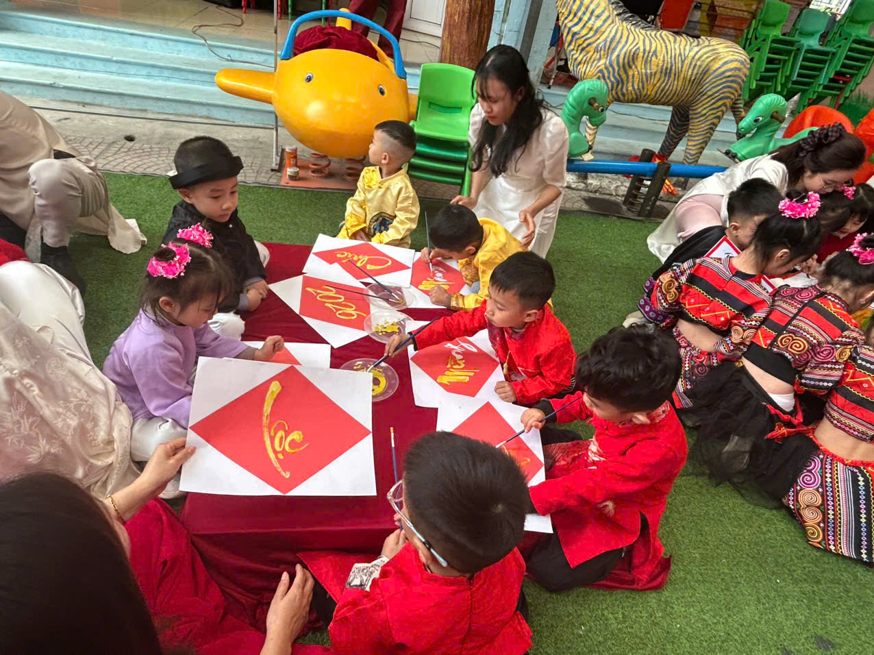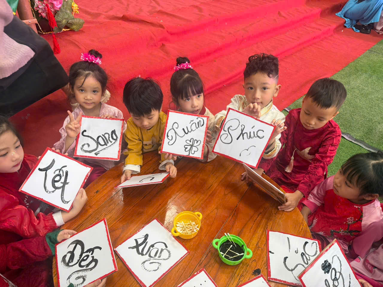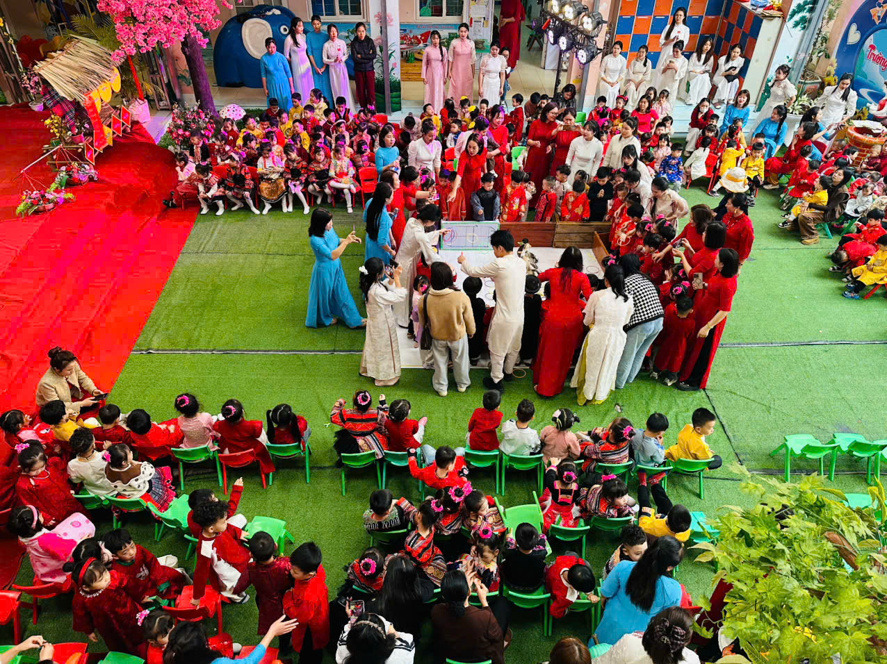 Đặc biệt, trong chương trình các cô giáo đã thiết kế, trang trí không gian chợ tết vô cùng phong phú và hấp dẫn. Các bé được hoá thân thành những ông đồ, nghệ nhân, thương nhân, du khách… tham gia trải nghiệm đi chợ tết, du xuân, viết thư pháp, câu đối, chơi các trò chơi dân gian mang đậm bản sắc của các dân tộc như: Ném còn, Ném vòng cổ vịt… Những hoạt động này giúp các bé hiểu thêm về phong tục đón Tết cổ truyền của mỗi dân tộc. Mang lại cho bé niềm vui, hứng khởi khi tết đến xuân sang và những khoảnh khắc thật đáng nhớ bên cô giáo và bạn bè.