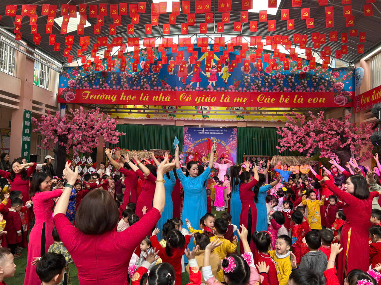 Bên thềm xuân mới Bính Ngọ, mừng Đại hội đại biểu toàn quốc lần thứ XIV của Đảng thành công rực rỡ, Mừng Đảng thêm tuổi mới trường mầm non Hoa Hồng hân hoan tổ chức chương trình “MỪNG XUÂN DÂNG ĐẢNG - MỪNG BÉ THÊM MỘT TUỔI ” nhằm mang đến cho các con một ngày hội thật vui tươi, ấm áp, giúp các bé cảm nhận được bầu không khí rộn ràng khi tết đến xuân sang, cảm nhận được niềm vui và hạnh phúc khi được sinh ra trên đất nước yên bình, no ấm, được lớn lên trong vòng tay yêu thương của gia đình, thầy cô…