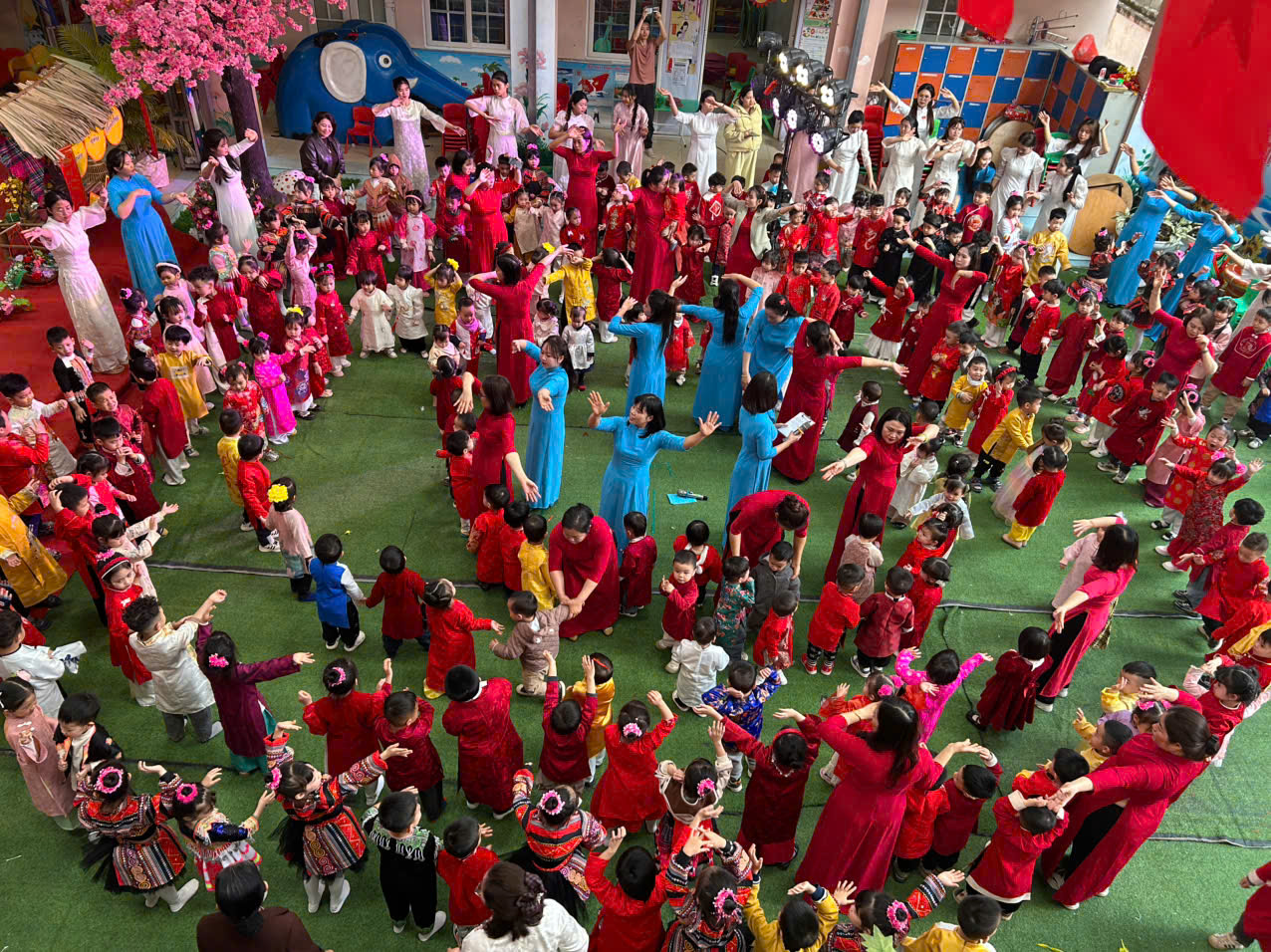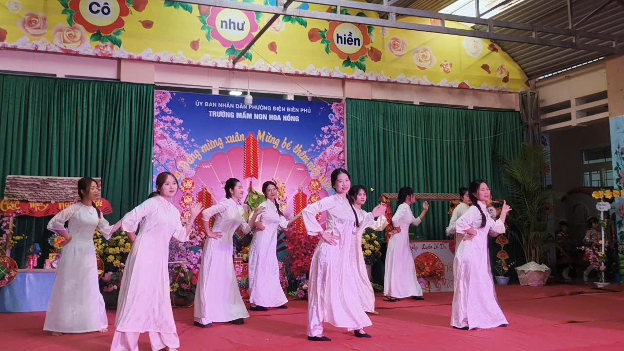 Mở đầu là các tiết mục văn nghệ đặc sắc do cô và trò nhà trường cùng các em giáo sinh thực tập biểu diễn. Các tiết mục mang đậm hương sắc mùa xuân, không khí tươi vui của ngày tết, ca ngợi Đảng cộng sản quang vinh… được dàn dựng công phu, sáng tạo, phù hợp với sự hồn nhiên, nhí nhảnh, đáng yêu và phát huy được các năng khiếu nghệ thuật của các bé.