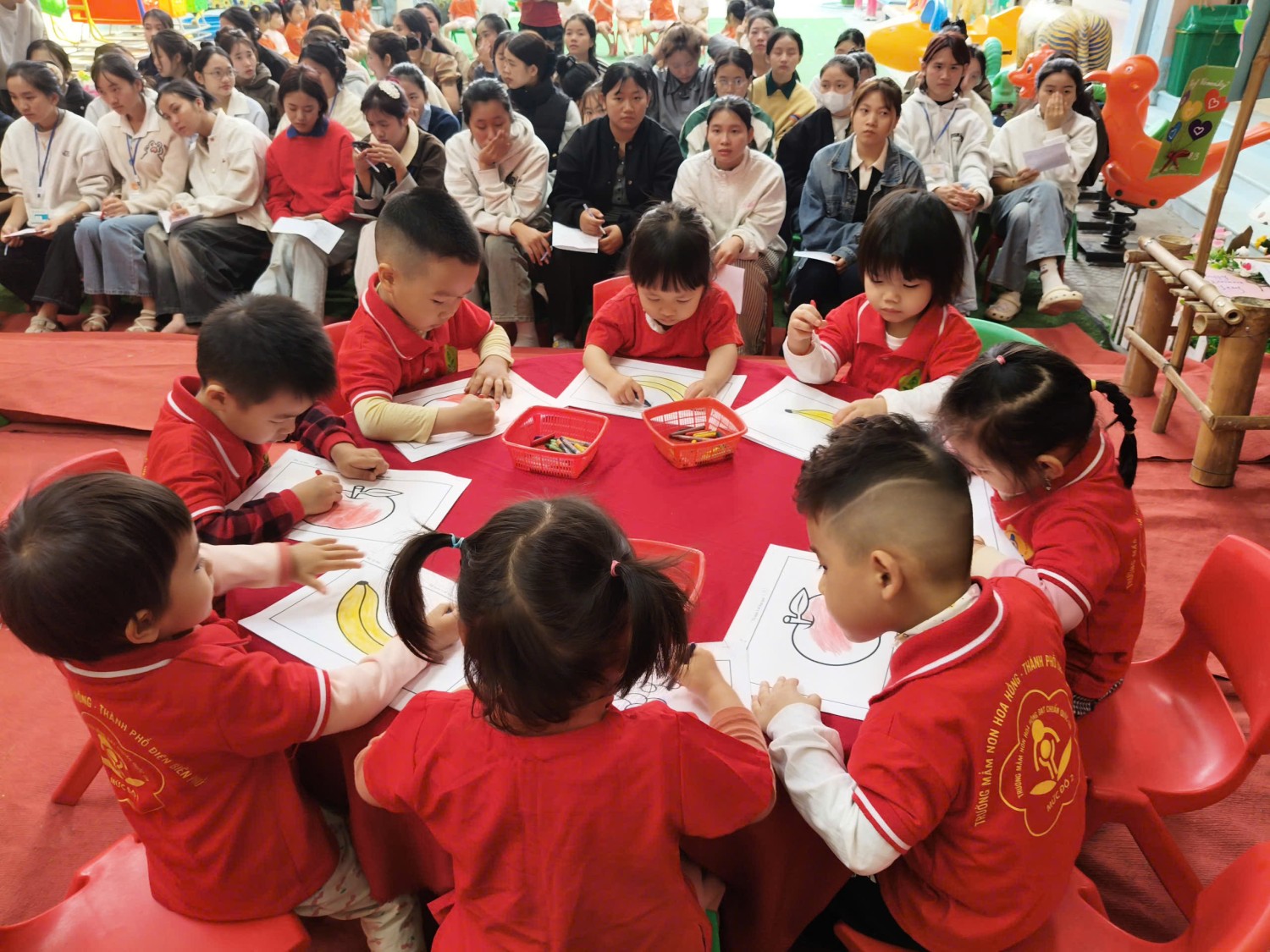 Để giúp các em sinh viên được quan sát những tiết dạy thực tế sinh động, hiệu quả nhất, hiểu và nắm được công tác tổ chức một tiết dạy. Các giáo viên tham gia dạy mẫu cùng ban giám hiệu nhà trường đã chuẩn bị kĩ lưỡng từ khâu xây dựng giáo án, chuẩn bị đồ dùng thiết bị dạy học, trang phục, lựa chọn nội dung bài học, phương pháp giáo dục, hình thức, quy trình tổ chức tiết học… phù hợp với đặc điểm tâm sinh lí lứa tuổi và khả năng của trẻ. Qua các hoạt động giáo dục thuộc các lĩnh vực phát triển thể chất được thực hiện ở 4 độ tuổi khác nhau do các cô giáo Hà Thị Duyên, Bùi Thị Ánh. Nguyễn Thị Hiền, Trần Thị Thuỷ thực hiện. Các bạn sinh viên đã được trực quan rõ ràng và học hỏi các kĩ năng dạy học, xử lí các tình huống trong tiết dạy cũng như áp dụng những kiến thức được học vào thực tế.