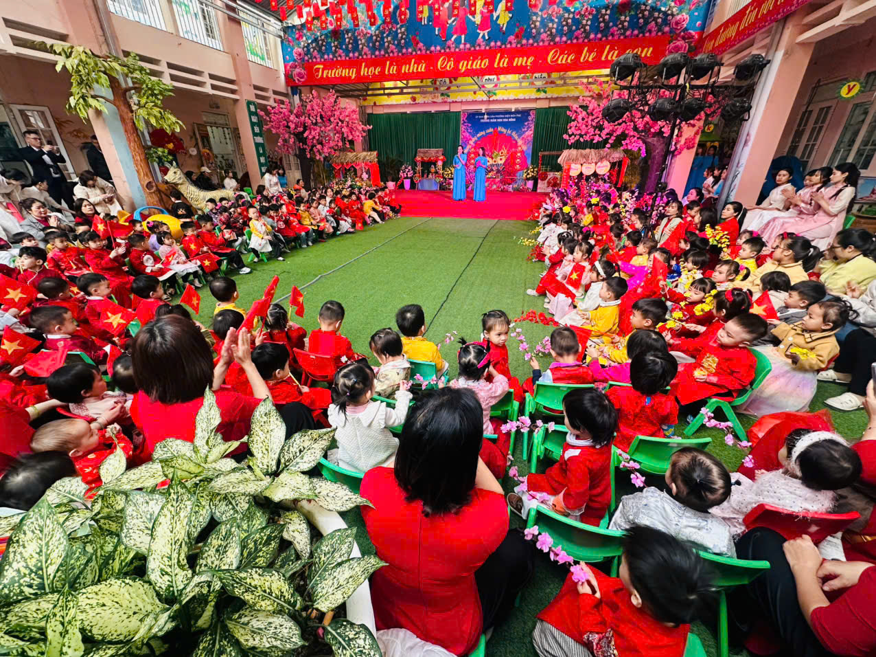Mở đầu là các tiết mục văn nghệ đặc sắc do cô và trò nhà trường cùng các em giáo sinh thực tập biểu diễn. Các tiết mục mang đậm hương sắc mùa xuân, không khí tươi vui của ngày tết, ca ngợi Đảng cộng sản quang vinh… được dàn dựng công phu, sáng tạo, phù hợp với sự hồn nhiên, nhí nhảnh, đáng yêu và phát huy được các năng khiếu nghệ thuật của các bé.
