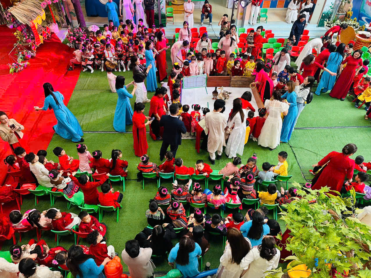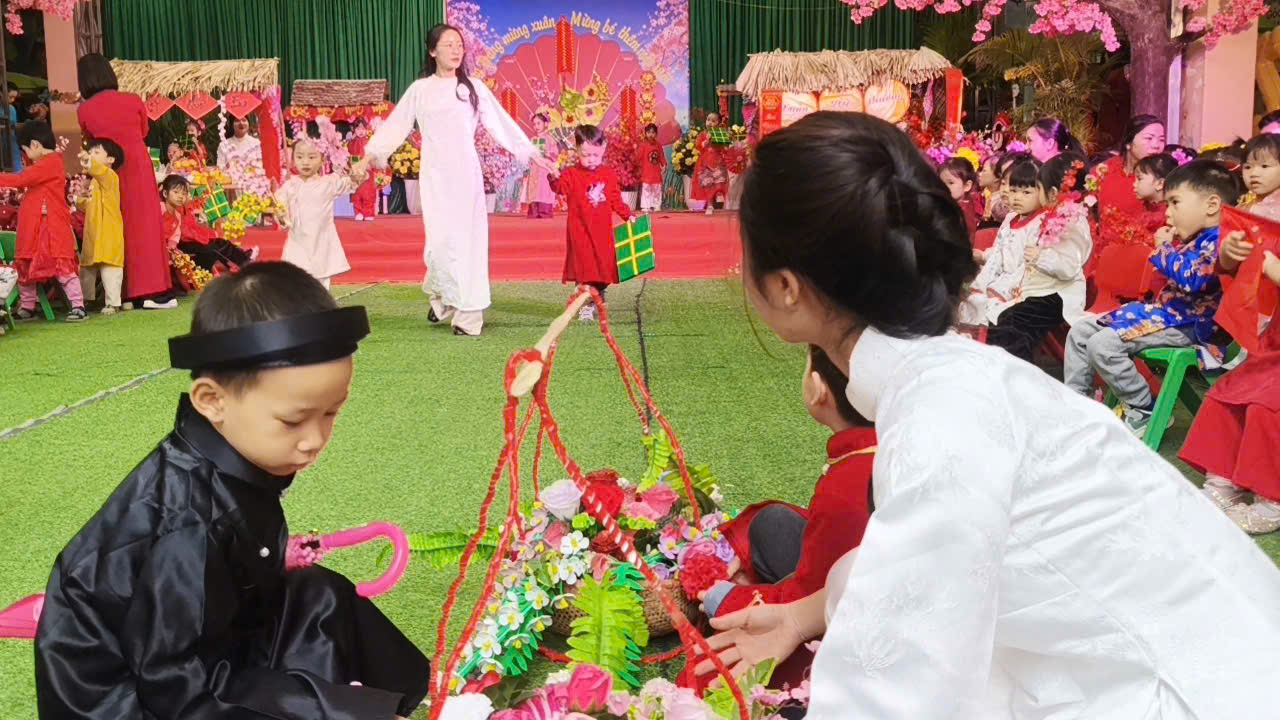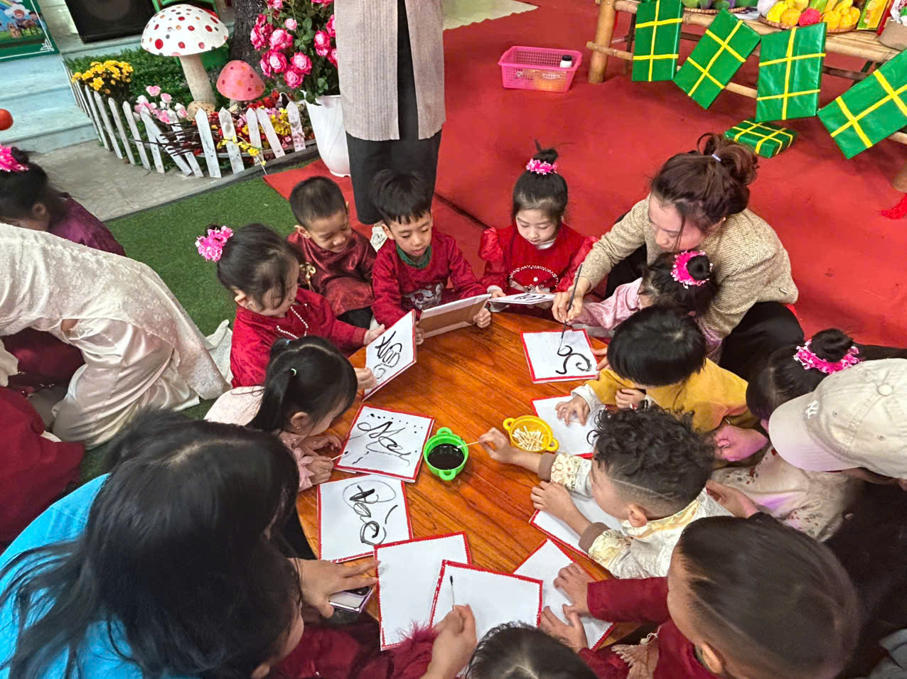 Đặc biệt, trong chương trình các cô giáo đã thiết kế, trang trí không gian chợ tết vô cùng phong phú và hấp dẫn. Các bé được hoá thân thành những ông đồ, nghệ nhân, thương nhân, du khách… tham gia trải nghiệm đi chợ tết, du xuân, viết thư pháp, câu đối, chơi các trò chơi dân gian mang đậm bản sắc của các dân tộc như: Ném còn, Ném vòng cổ vịt… Những hoạt động này giúp các bé hiểu thêm về phong tục đón Tết cổ truyền của mỗi dân tộc. Mang lại cho bé niềm vui, hứng khởi khi tết đến xuân sang và những khoảnh khắc thật đáng nhớ bên cô giáo và bạn bè.
