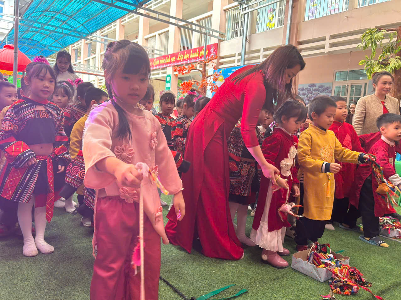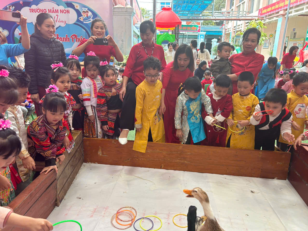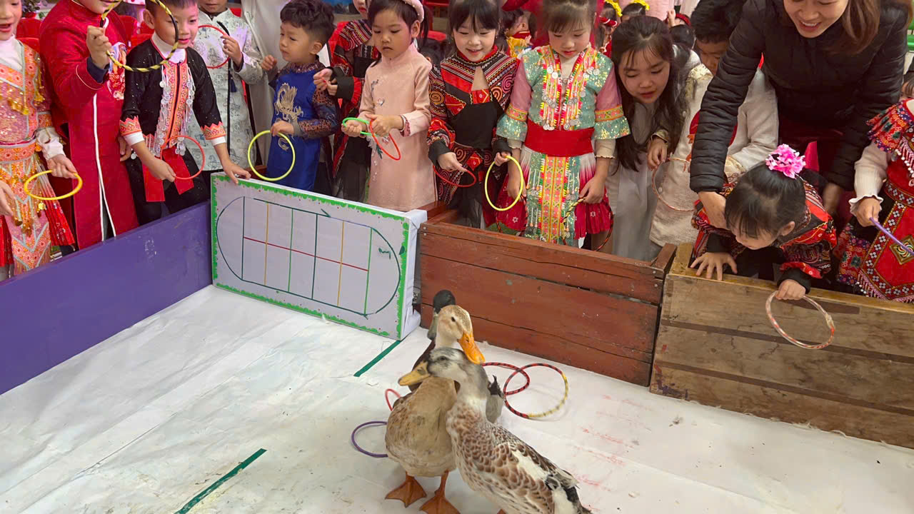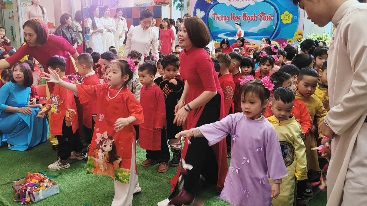Đặc biệt, trong chương trình các cô giáo đã thiết kế, trang trí không gian chợ tết vô cùng phong phú và hấp dẫn. Các bé được hoá thân thành những ông đồ, nghệ nhân, thương nhân, du khách… tham gia trải nghiệm đi chợ tết, du xuân, viết thư pháp, câu đối, chơi các trò chơi dân gian mang đậm bản sắc của các dân tộc như: Ném còn, Ném vòng cổ vịt… Những hoạt động này giúp các bé hiểu thêm về phong tục đón Tết cổ truyền của mỗi dân tộc. Mang lại cho bé niềm vui, hứng khởi khi tết đến xuân sang và những khoảnh khắc thật đáng nhớ bên cô giáo và bạn bè.